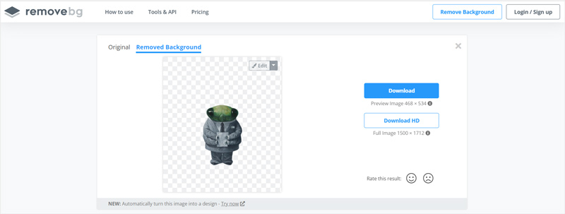 Como se mencionó anteriormente, esta aplicación de borrado de fondo en línea eliminará automáticamente el fondo de la imagen. Entonces, después de cargar el archivo de imagen, todo lo que necesita es hacer clic en el Descargar or Descargar HD botón para guardarlo en su computadora. Debe registrar su cuenta para descargar la imagen HD.