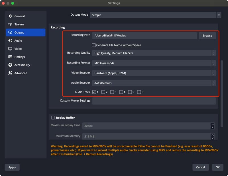Click Browse to select a folder to save your OBS recordings. OBS Studio allows you to record lossless quality. However, that will lead to a large recording file and may affect the whole performance. You will get a related information prompt before you make the decision. MP4 is the recommended recording format. If you want to capture multiple audio tracks, you should select the MKV format. Then, select Video Encoder and Audio Encoder based on your needs.