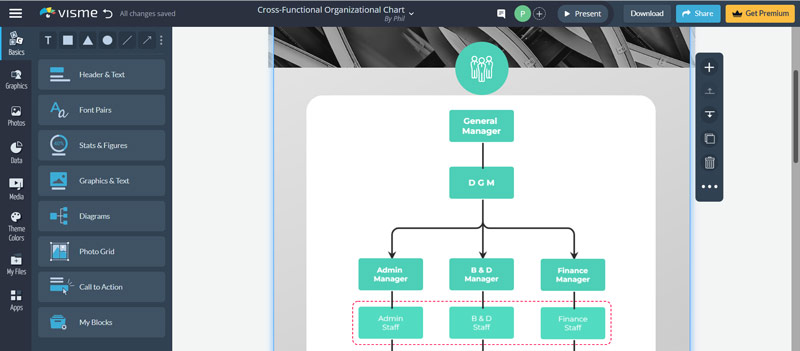Después de iniciar sesión en su cuenta, puede buscar en el organigrama para localizar rápidamente las plantillas relacionadas. Algunas plantillas de organigramas son de pago. Aquí primero comienzas con uno gratis. Puede seguir las instrucciones en pantalla para editar y crear su organigrama. Cuando finalice la creación del organigrama, puede hacer clic en el botón Compartir en la esquina superior derecha y luego elegir Descargar para guardarlo en su computadora.