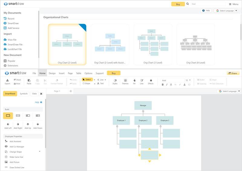 SmartDraw es un creador de diagramas de flujo fácil y potente que se utiliza principalmente para crear todo tipo de diagramas. tiene un Creador de organigramas en línea para ayudarlo a visualizar rápidamente la información de los empleados y crear organigramas. Puede usar sus comandos simples para agregar empleados mientras mantiene la estructura organizacional. Es capaz de realinear y organizar automáticamente todos los elementos después de agregar, mover o eliminar empleados.