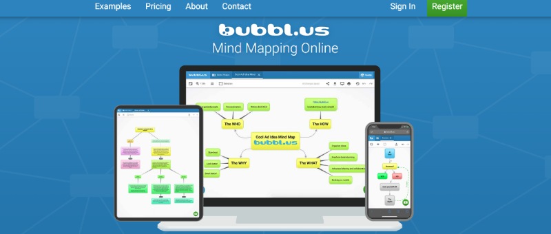 Bubble.US le permite organizar visualmente sus pensamientos de una manera sensata y le permite concentrarse mejor en su tarea e ideas. Puede configurar un mapa de burbujas para escribir, tomar notas, resumir un libro y colaborar. Sin embargo, primero debe iniciar sesión para acceder a este creador de mapas de burbujas.