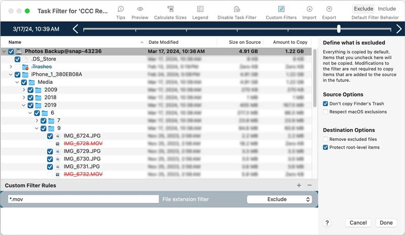 Carbon Copy Cloner crea copias de seguridad automáticamente según tus necesidades. Puedes programarlas a intervalos específicos, como mensuales, diarios e incluso cada hora. Esto garantiza que todos los datos recién creados estén actualizados y protegidos. Una gran función avanzada de Carbon Copy Cloner es que solo puede respaldar los cambios realizados en tus archivos. Esta función es especialmente útil para copias de seguridad frecuentes. Además de ahorrar tiempo, no ocupa espacio de almacenamiento.