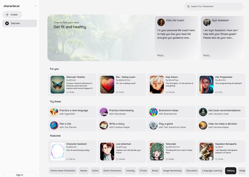 Character.AI es conocido por su capacidad para crear chatbots virtuales basados en personajes específicos. Se le permite interactuar con estos chatbots de IA, participar en conversaciones, hacer diversas preguntas e incluso representar escenarios. La plataforma ofrece muchos personajes diferentes entre los que puedes elegir, como figuras históricas como Napoleón, Tesla y Einstein, íconos literarios, héroes de anime, personajes de juegos y otros.