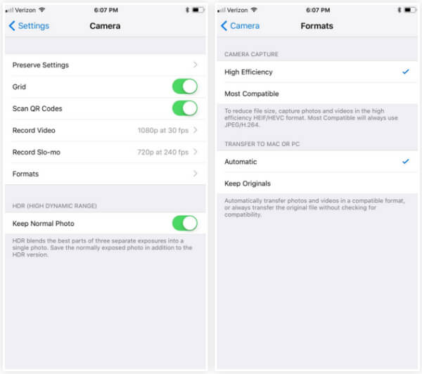 Según Apple, sus fotografías y videos mantendrán la misma calidad y claridad, pero se utilizará la mitad del espacio de almacenamiento que antes. Para videos, hay HEVC (codificación de video de alta eficiencia) en H.265 en lugar de H.264, y para fotos, hay HEIF (formato de archivo de imagen de alta eficiencia). Para usar mejor esta función, simplemente navegue a Configuración> Cámara> Formatos y asegúrese de que esté marcada la opción "Alta eficiencia". Los videos se guardarán como archivos HEVC .MOV, mientras que las imágenes se guardarán como .HEIC en lugar de .JPG. Cómo convertir HEIC a JPG?