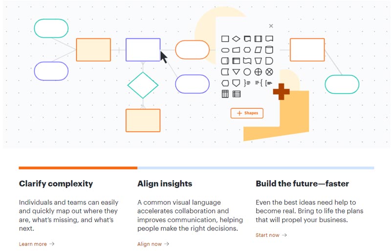 Lucidchart presenta muchas funciones de colaboración en equipo y configuración de tareas compartidas de uso común. Como se mencionó anteriormente, combina diagramación, visualización de datos y colaboración. Ofrece una manera conveniente de dibujar nuevos documentos o editar documentos existentes. Lucidchart está equipado con muchas bibliotecas de objetos y plantillas prefabricadas para comenzar un diagrama fácilmente. Ofrece la funcionalidad de arrastrar y soltar para garantizar que pueda colocar rápidamente sus elementos preferidos en su diagrama.