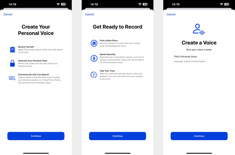 Si desea que su Personal Voice esté disponible en otros dispositivos Apple asociados, puede alternar la función Compartir entre dispositivos. Además, puedes decidir si permites que las aplicaciones utilicen tu voz personal o no. Haga clic en Continuar para comenzar a crear su voz personal. Puedes darle un nombre a la voz creada.