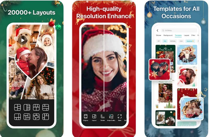 Collage de foto es una aplicación popular para crear vídeos y collages de montaje fotográfico. Ofrece una interfaz sencilla con varios diseños, pegatinas, fondos y opciones de texto para mejorar tus creaciones.