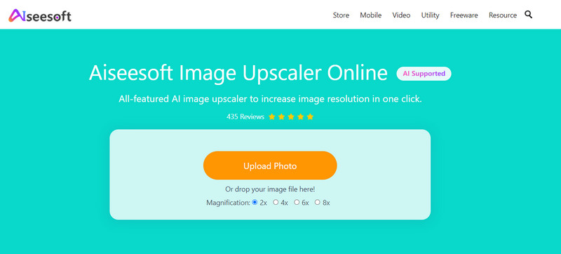 Aiseesoft Image Upscaler en línea es el redimensionador de fotos en línea que puede usar para aumentar la calidad de sus imágenes al 800%. Con la ayuda de este software, puede mejorar la calidad visual de la imagen que cargue aquí con un solo clic. Este software es gratuito y está basado en la web, por lo que no necesitará descargar un instalador. Puede usarlo de inmediato en cualquier motor de búsqueda una vez que acceda al software. Por lo tanto, si necesita cambiar el tamaño de la relación de aspecto de la imagen que tiene en su dispositivo, entonces este es el software en línea que lo ayudará.