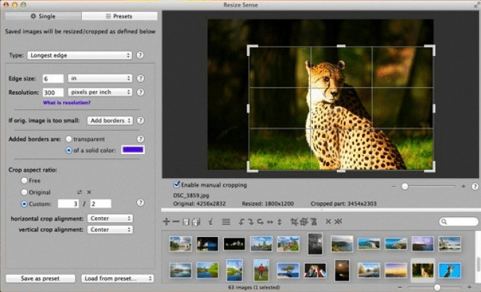 Para un redimensionador de píxeles de foto preciso en Mac, es posible que desee tener Resize Sense. Esta herramienta se jacta de su flexibilidad para cambiar el tamaño de la imagen, y tiene razón. Con este software en Mac, puede cambiar la relación de aspecto de la imagen para que se ajuste a los requisitos de la mayoría de los diseños web y gráficos, o puede hacerlo para uso personal. Además de cambiar la relación de aspecto de la imagen, esta herramienta puede cambiar el formato de la imagen, recortar, rotar, voltear y cambiar los metadatos. Es por eso que se volvió flexible a sabiendas al hacer la edición básica de imágenes.