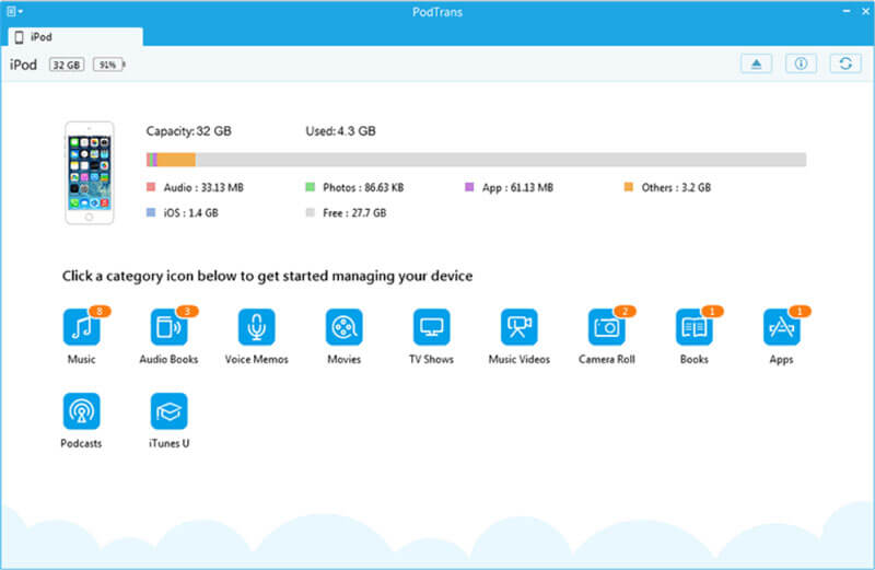 PodTrans es una transferencia de música de iPod confiable que ayuda a transferir música de iPod a PC/Mac sin problemas. Admite varios tipos de datos, como música, películas, programas de televisión, videos musicales, podcasts, iTunes U, audiolibros, notas de voz, rollo de cámara y aplicaciones. PodTrans no solo funciona como una buena transferencia de datos de iPod, sino que también actúa como administrador de datos de iPod. Puede buscar, agregar, eliminar canciones y películas en su dispositivo.
