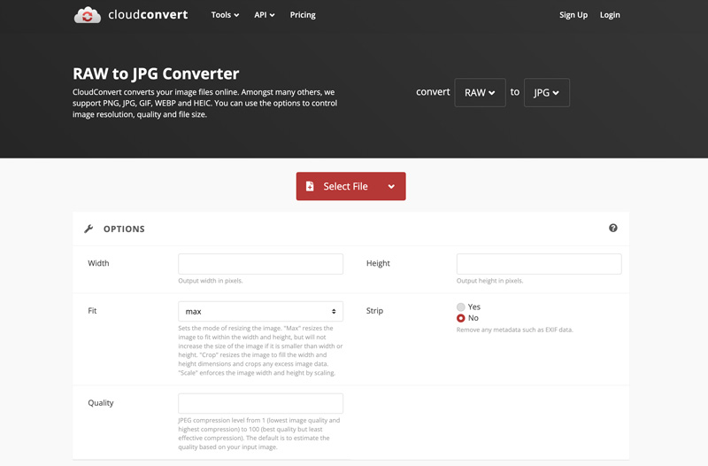 CloudConvert ofrece una versión gratuita que le permite convertir una cantidad limitada de archivos por día con un tamaño de archivo máximo de 25 MB. Este conversor de RAW a JPG en línea admite más de 200 formatos, incluidas las variantes RAW utilizadas por diferentes fabricantes de cámaras. Más allá de la conversión básica de RAW a JPG o PNG, ofrece opciones para ajustar la calidad de la imagen y el tamaño del archivo. Pero debes saber que su plan gratuito tiene limitaciones y carece de funciones avanzadas.