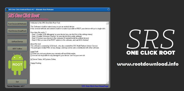SRS Root es una solución simple para rootear su dispositivo Android. Esta aplicación raíz de Android contiene múltiples exploits para obtener acceso de raíz en su Android. Le permite rootear sus versiones de Android de 1.5 a 4.2 actualmente. Además, esta aplicación raíz está diseñada con una opción para desrootear su dispositivo Android con un solo clic.