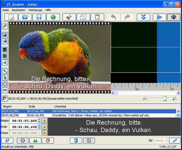Este programa de traducción multiplataforma utiliza casi todos los formatos de subtítulos populares y puede traducir, convertir, corregir y modificar los subtítulos existentes mientras es el software de creación para cualquier subtítulo nuevo. jubler requiere la última versión de JRE, MPlayer para ver los subtítulos y ASpell para verificar la ortografía incorrecta en los subtítulos.