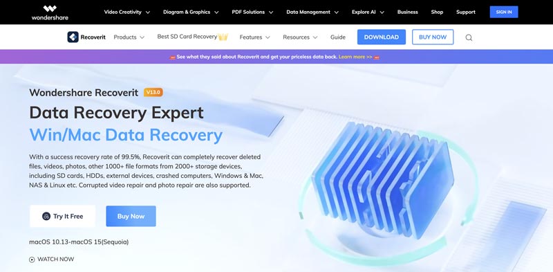 Recuperación de Maravilla es un famoso programa de recuperación de datos que se utiliza principalmente para recuperar archivos perdidos o eliminados de diferentes dispositivos de almacenamiento. Utiliza algoritmos avanzados para escanear y restaurar todo tipo de datos en su PC con Windows, Mac, discos duros externos, tarjetas de memoria y más. Wondershare Data Recovery puede manejar varias situaciones de pérdida de datos. Ya sea que haya eliminado documentos importantes accidentalmente o haya perdido fotos valiosas debido a un fallo del sistema y otras razones, puede confiar en él para rescatar estos archivos. Wondershare afirma ofrecer una tasa de recuperación exitosa del 99.5%.