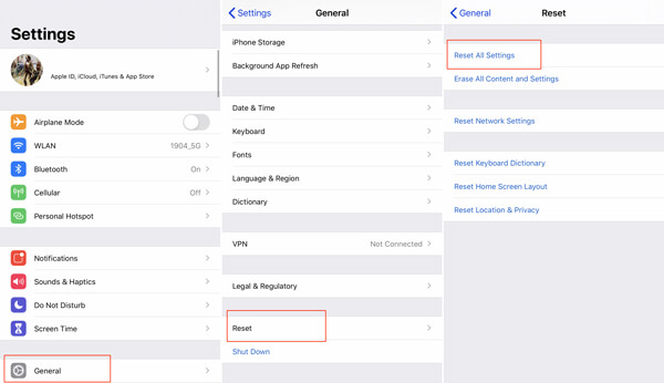 Paso 3 Cuando ingrese a la interfaz de Restablecer, toque Restablecer todas las configuraciones. Durante este paso, debe ingresar su contraseña de Apple y luego tocar Restablecer todas las configuraciones para confirmar la operación.