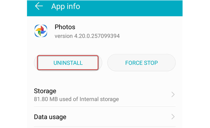 Google Photos te da la opción de desinstalar todas las actualizaciones. Puede probar este método para reparar la copia de seguridad de Google Photos pegada a la normalidad. Esto solo funciona para usuarios de teléfonos Android.