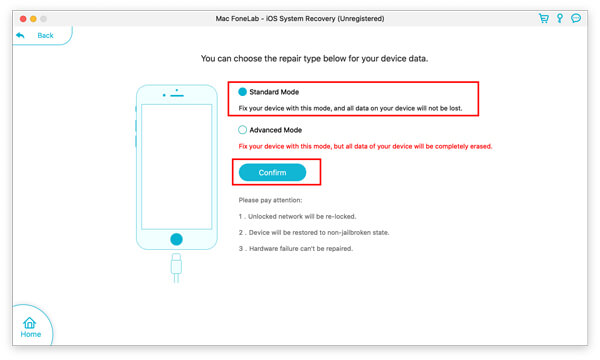 En este paso, debe seleccionar Modo estandar y haga clic Confirmar.