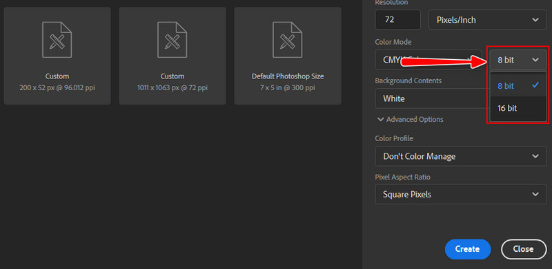 El problema puede residir cuando el tamaño de bit no está configurado en RGB de canal de 8 o 16 bits. No obstante, ese problema es rápido y fácil de abordar. Para comenzar a solucionar problemas. Abra un nuevo documento y verifique el tamaño de bit. Seleccione el cuadro desplegable para expandir el menú. Finalmente, elija 8 bits o 16 bits y guarde su foto una vez más.