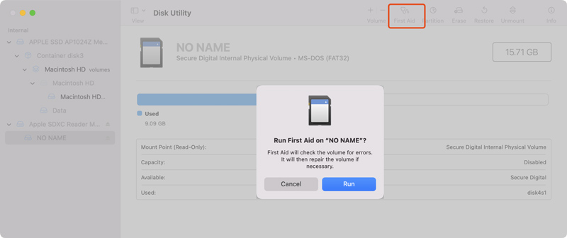 Si tu unidad USB no aparece en una Mac, puedes usar Primeros Auxilios para analizar y solucionar diversos problemas del sistema, como errores de directorio, archivos dañados y más. Puedes acceder a Primeros Auxilios en la Utilidad de Discos. Usa Spotlight en tu Mac para buscar y abrir la Utilidad de Discos, haz clic en tu dispositivo USB a la izquierda y luego pulsa el botón Primeros Auxilios. Debes hacer clic en "Montar" si tu unidad USB no está en estado de montaje.