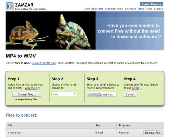 Notas: El convertidor de video en línea tiene la limitación. Por ejemplo, Zamzar solo te permite importar el archivo con un máximo de 50 MB.