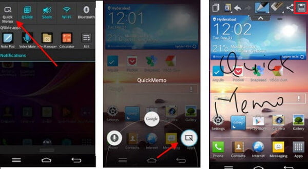 Además de usar la combinación de botones "Encendido" y "Bajar volumen", el teléfono inteligente LG también ofrece una función predeterminada inteligente, Nota rápida. QuickMemo puede permitirle tomar instantáneas en la pantalla del teléfono LG con facilidad, y luego puede editar la captura de pantalla con líneas, textos y más. Después de eso, puede guardar la captura en Galería aplicación.