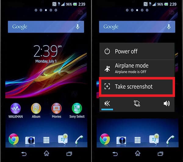 Además del método Stand Android, también puede presionar el botón "Encendido" y elegir la opción "Tomar captura de pantalla" para capturar su dispositivo Sony Xperia. La imagen de arriba muestra cómo capturar una captura de pantalla en el teléfono inteligente Sony Xperia Z.