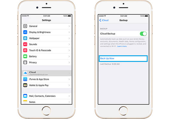 En su dispositivo iOS 8 o posterior: Toque "Configuración" > "iCloud" > Active "Fotos" > "Copia de seguridad" > Toque "Copia de seguridad ahora".