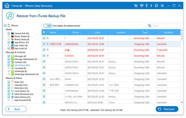 Paso 2 Después de escanear, puede encontrar todos los datos de copia de seguridad de iTunes que se muestran en la interfaz. Haga clic en "Historial De Llamadas" para verificar si puede encontrar los números de llamada eliminados. Seleccione las llamadas que desea recuperar y haga clic en "Recuperar" para descargar el historial de llamadas restaurado de su iPhone a su computadora.