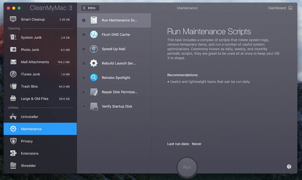 ◆ Mantenimiento: ejecute un conjunto de tareas manuales o programadas para optimizar su Mac, como configurar permisos de disco de reparación, verificar el disco de inicio, adoptar Spotlight, acelerar Mail, etc.