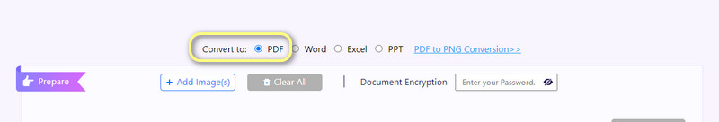 Para un convertidor en línea gratuito para convertir imágenes en PDF, puede confiar en Aiseesoft PDF PNG Convertidor en línea. Cuenta con una función de conversión por lotes que permite a los usuarios ahorrar tiempo y esfuerzo al procesar varios archivos simultáneamente. Sin mencionar que puede cargar y convertir varios formatos de imagen al mismo tiempo al formato de documento deseado. De acuerdo con eso, el programa le permite convertir a PDF, Word, Excel y PPT.
