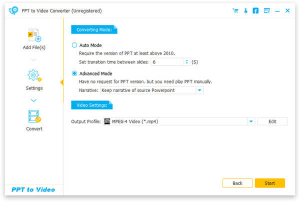 Este convertidor de PPT a video le ofrece dos modos de conversión. Uno es "Modo automático" y el otro es "Modo avanzado".