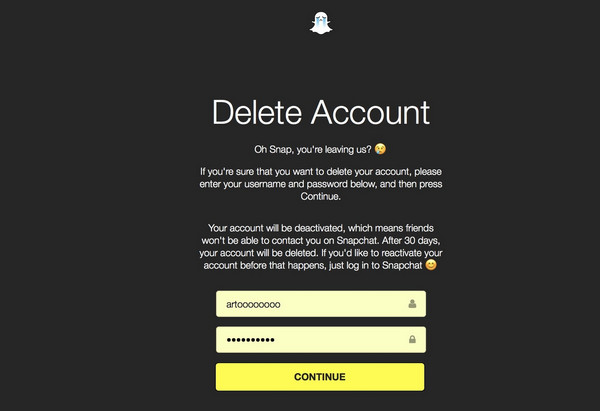 Paso 5En la página siguiente, se le pedirá que confirme la eliminación. Simplemente ingrese la contraseña de Snapchat una vez más y haga clic/toque en "Continuar". Por fin, recibirá una confirmación de que su cuenta de Snapchat ha sido desactivada.