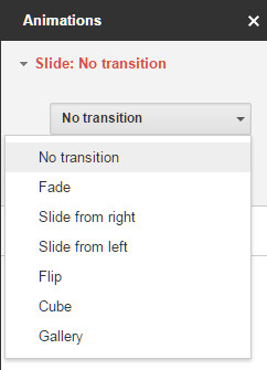 Google Transition presentará los efectos de transición. Puede usar animaciones de desvanecimiento, o lado desde la derecha, o voltear, etc. Y la velocidad también puede establecerse como lenta, media o rápida. Para la transición, puede aplicar las animaciones a todas las diapositivas o solo a la página actual.