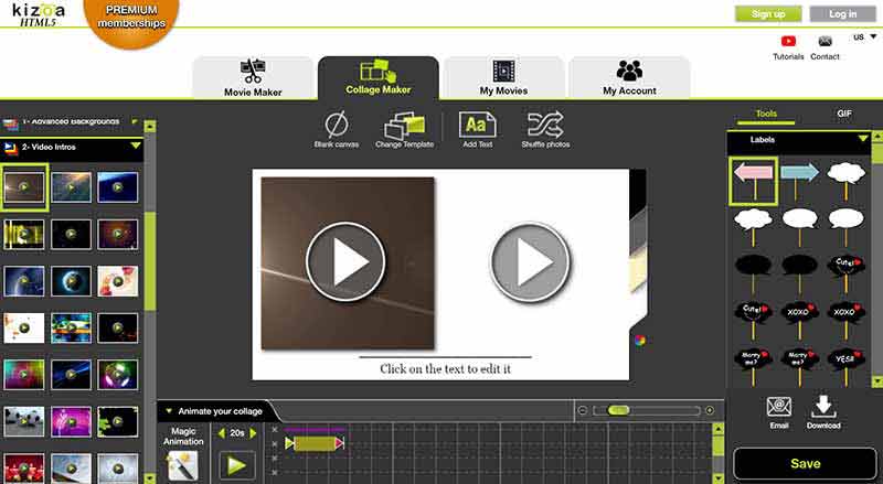 Aunque no se recomienda, algunas aplicaciones web pueden ayudarlo a hacer un collage de fotos y videos con música en línea. Son una forma conveniente de hacer el trabajo de vez en cuando. Además, debe tener una buena conexión a Internet. Usamos Kizoa como ejemplo para mostrarle el flujo de trabajo. Es un creador de collage de videos en línea gratuito para estudiantes y pequeñas empresas.