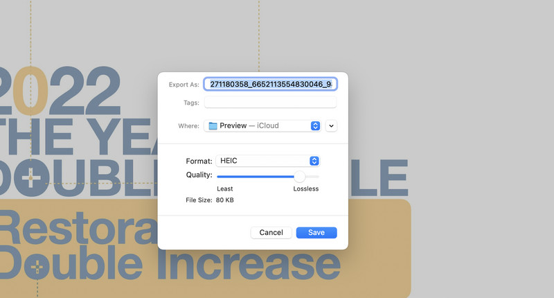 También hay un programa para macOS llamado Preview que viene con una función de exportación, lo que le permite cambiar JPG a HEIC. Sin embargo, muchas personas, e incluso los usuarios de Mac, desconocen esta útil función. Por otro lado, no sorprende que gestione el formato HEIC con bastante eficacia porque el formato de alta eficiencia es compatible con los dispositivos iOS de Apple, como los iPhone. Más allá de eso, los usuarios pueden ajustar la configuración de calidad a su resultado deseado. El único inconveniente del programa es que no puede procesar archivos por lotes. Aquí hay una guía simple sobre cómo convertir JPG a HEIC.