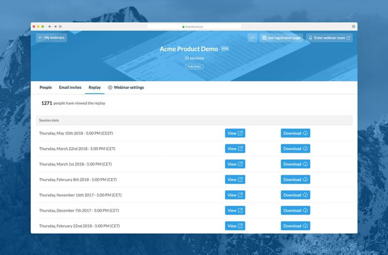 Livestorm brinda el servicio de grabaciones de video automáticas que pueden grabar seminarios web y reuniones de video. Tanto el anfitrión como los asistentes pueden acceder a la grabación instantáneamente a menos que haya desactivado la grabación en la configuración de su reunión o le haya pedido a Livestorm que la elimine de su base de datos. Las repeticiones solo están disponibles para los inscritos en la reunión. Los inscritos que no se unieron a la reunión seguirán recibiendo un enlace para acceder a la sala y ver la repetición. Puede ver y descargar repeticiones de seminarios web en el panel de su reunión, en "Responder" una vez que finaliza la reunión.