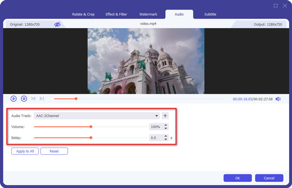Video Sound Editor ofrece muchas funciones de edición de sonido para ayudarlo a editar pistas de audio. Puede editar el archivo de audio del video según sus necesidades. Para bajar el volumen, puede hacer clic en "Editar" en la barra de menú y elegir "Audio". Aquí puede encontrar la función "Volumen". Puede arrastrar la barra de control para bajar el volumen. O puede ingresar directamente el porcentaje para bajar el volumen.