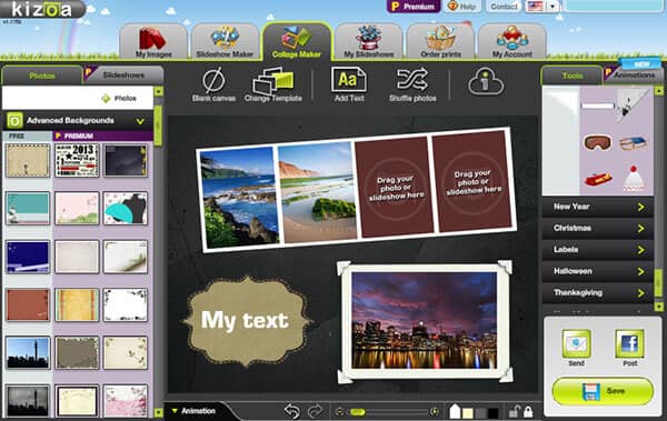 Creador de collage Kizoa es una aplicación en línea de edición de videos fotográficos basada en la web para hacer collages de imágenes y videos. Te permite crear collages de fotos y películas directamente en su navegador.