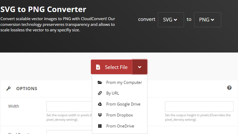 Otro programa en línea que puede usar para convertir SVG a PNG es CloudConvert. El programa admite muchos formatos de conversión de imágenes, incluida la conversión de SVG a PNG. Lo que hace que esta herramienta sea diferente es que tiene la capacidad de cargar archivos desde la computadora local, Google Drive, Dropbox y OneDrive. También puede cargar a través de URL cuando su archivo SVG se deriva de otro sitio web. Además, te permite acceder a opciones avanzadas. Con él, los usuarios pueden cambiar la dimensión o el ancho y la altura. Además de eso, puede configurar la resolución y convertir SVG a PNG grande como desee. Aprenda cómo funciona esta herramienta leyendo el tutorial.