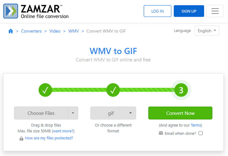 Otro conversor de WMV a GIF en línea que deberías probar es Zamzar. Este convertidor de vídeo a GIF es fácil de usar y proporciona una calidad excelente. Es gratis todo el tiempo, pero requiere pago para cargar archivos de mayor tamaño. Para utilizar Zamzar, siga los pasos a continuación: