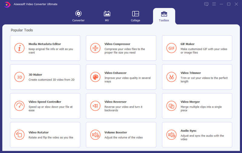Aiseesoft Video Converter Ultimate es el mejor software de conversión de video. Le permite convertir videos, incluso videos 4K, a formatos de video populares, como MP4, M4V, MKV y MOV. Y la velocidad de conversión es hasta 30 veces más rápida, lo que puede ver más profundamente en la conversión de HD/4K UHD. Además de la función de conversión, sus funciones de edición también son atractivas. Le permite agregar pistas de audio externas y marcas de agua, recortar, rotar y recortar videos. En la última versión, hay algunas funciones nuevas, como Editor de metadatos de medios, Compresor de video, Mejorador de video, Creador de GIF, Controlador de velocidad de video, Inversor de video, etc. Esta página le mostrará cómo usar estas funciones poderosas en detalle.
